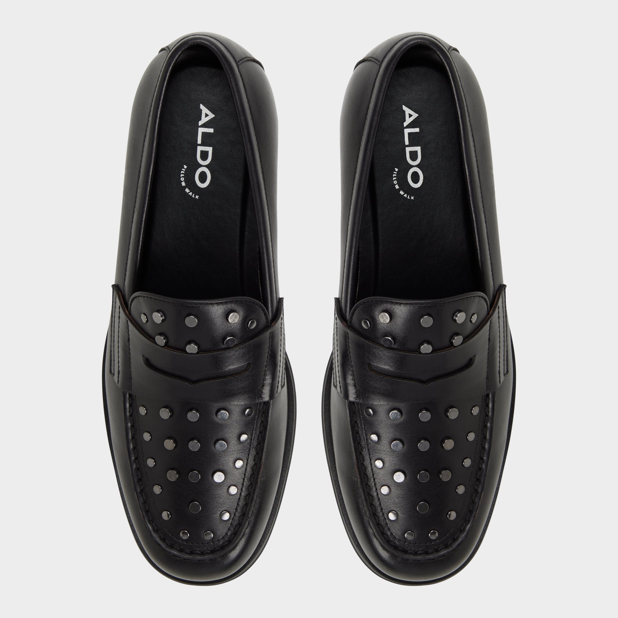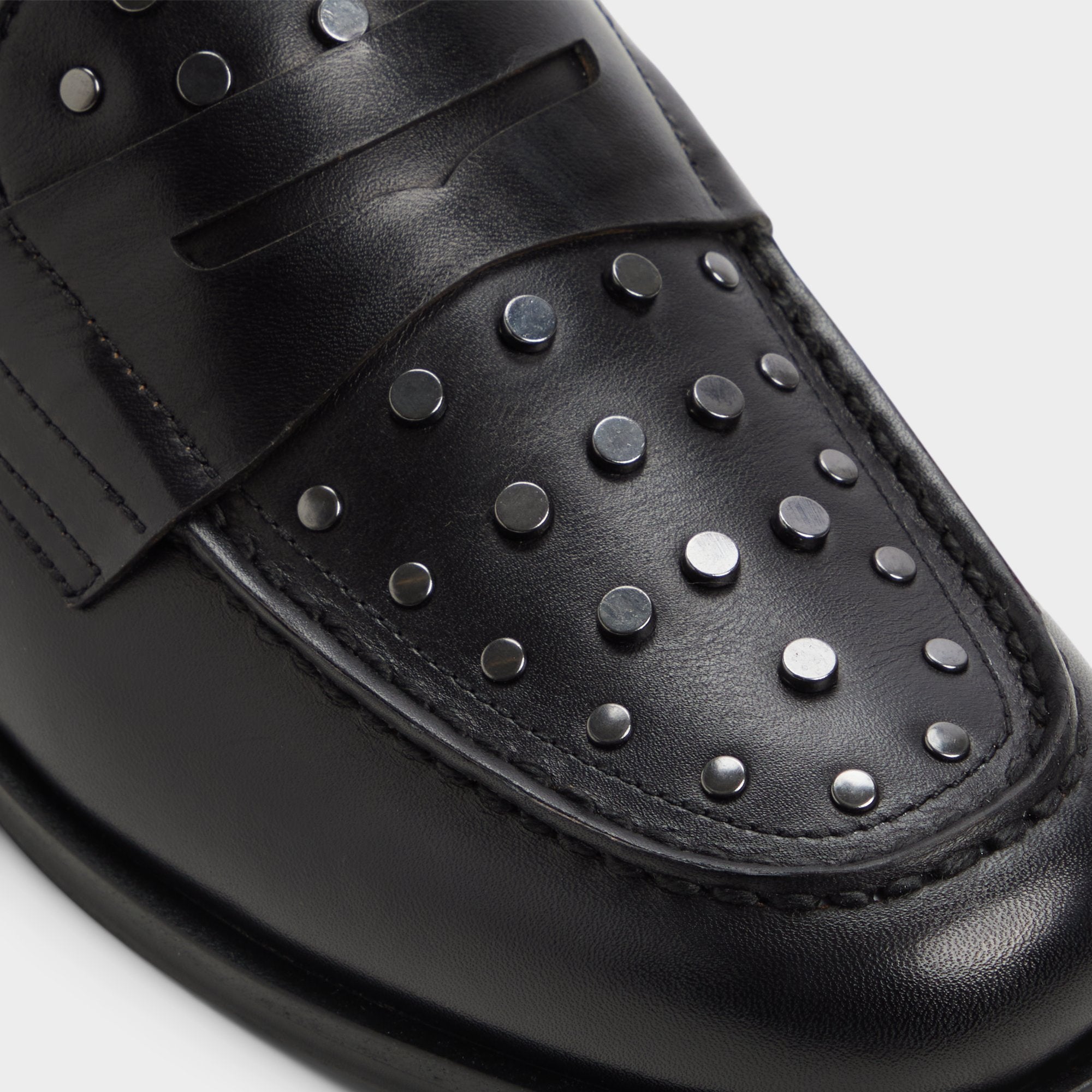 Gunmetal studs arc across the penny strap and toe, giving an edge to this black leather loafer you can wear from the office to after-hours. Pair with slim charcoal suits for office success or wear with cuffed jeans at gallery nights—the studs’ gleam makes a statement.