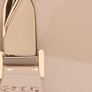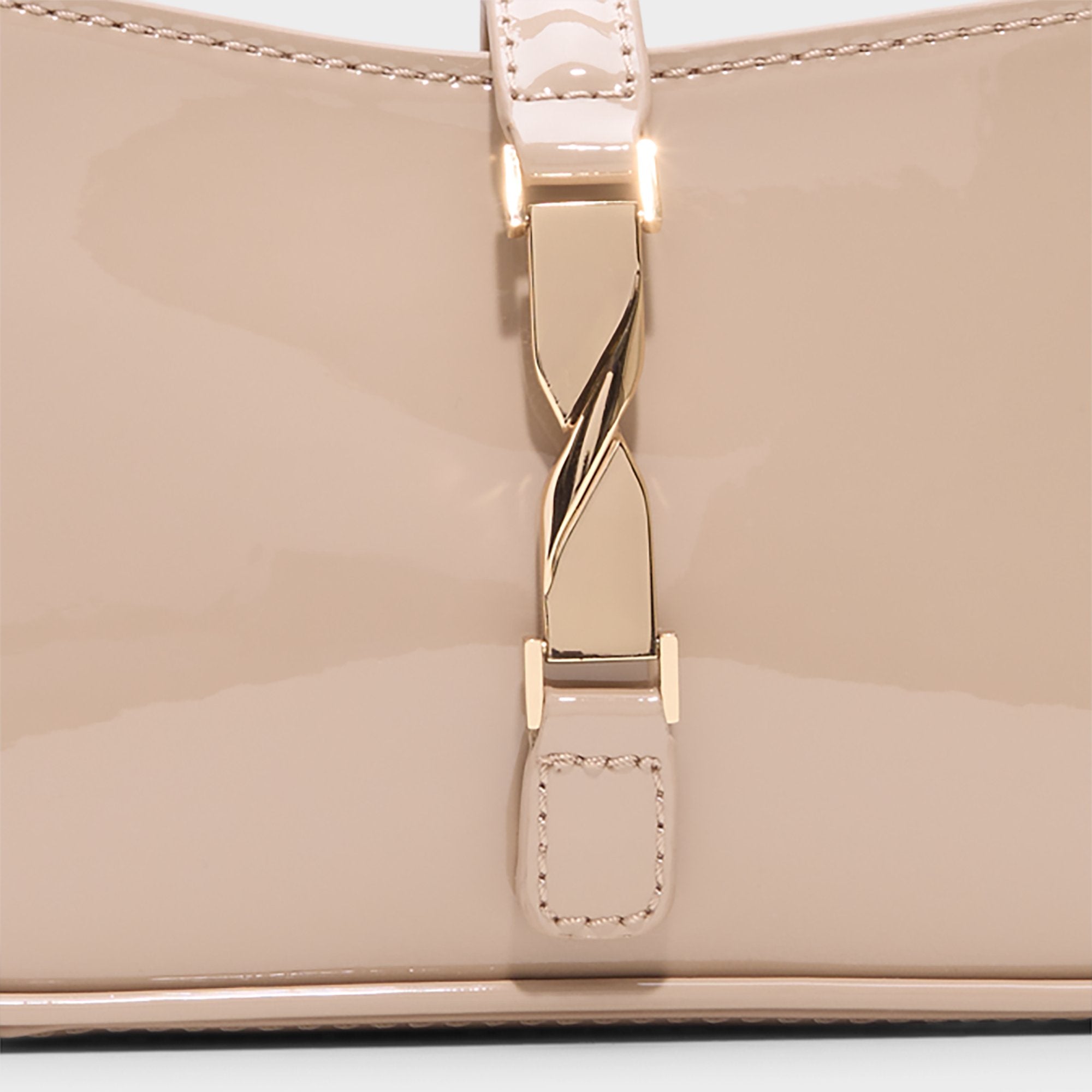 Glossy patent shines with a sculptural gold twist buckle, turning this sleek beige shoulder bag into a subtle mirror that catches city lights while the slim strap keeps movement easy. Tuck it against a satin slip for rooftop dates or sling it with wide-leg denim on coffee runs to polish every step.