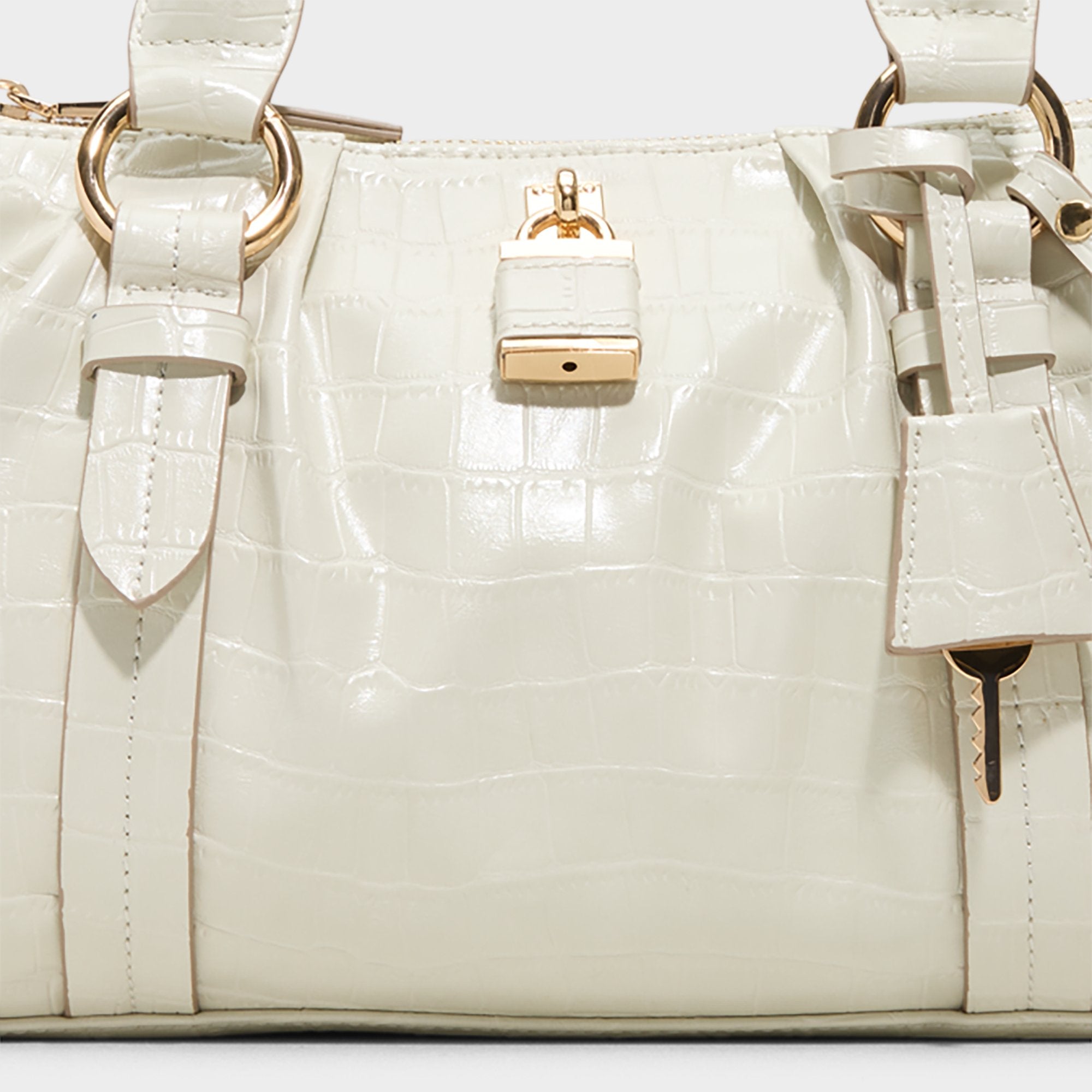 Glossy croc-emboss leather shapes this barrel satchel, accented with gold-tone hardware and a lock-and-key charm that hints at the secure turn-lock closure inside. Carry it to client meetings with a crisp blazer or sling it alongside slip dresses for evening dates to polish the look.