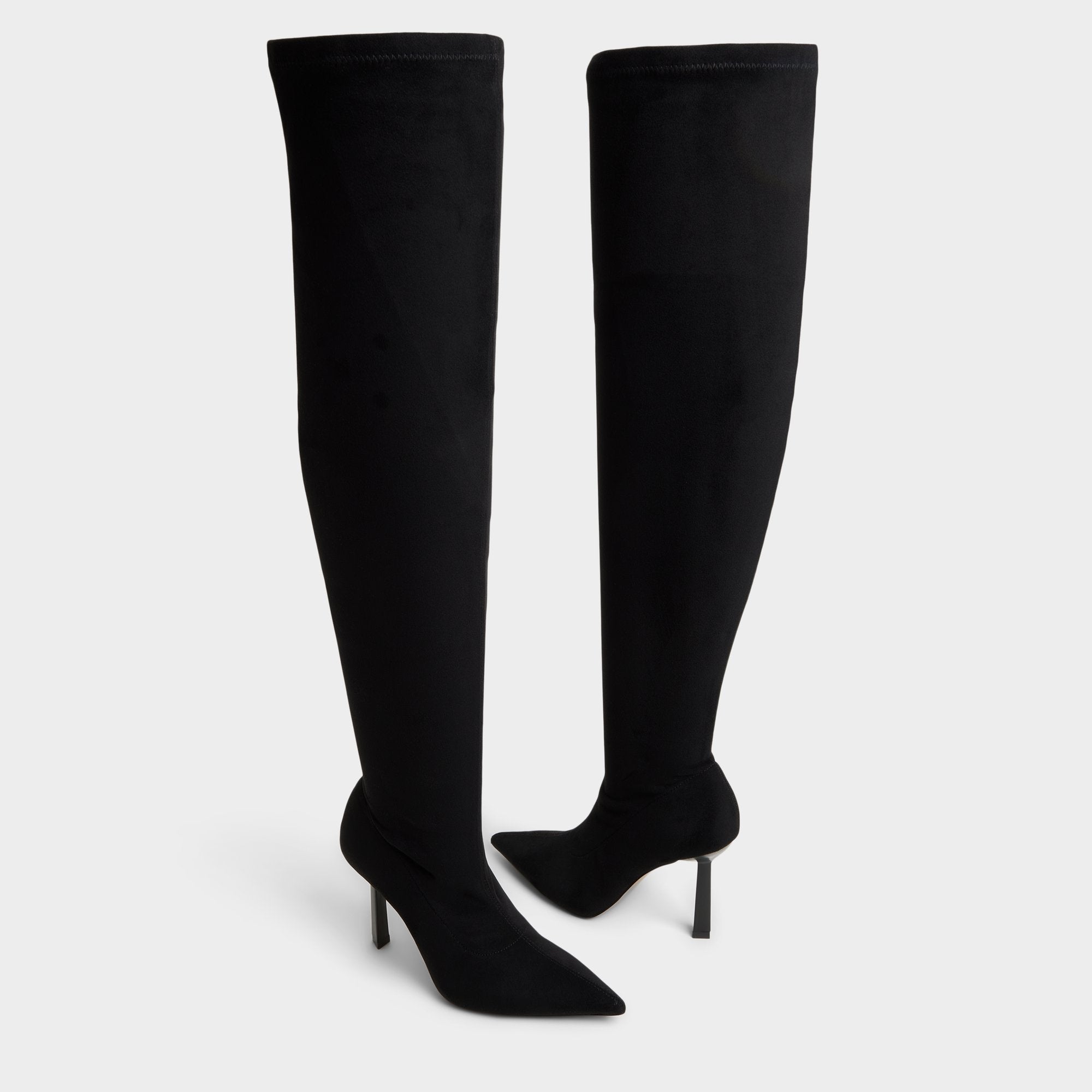 Drama climbs past the knee in butter-soft suede, wrapping legs in seamless columns ending in razor-sharp points and slim stiletto lifts every stride like city lights after dark. Let it steal focus with a mini sweaterdress at rooftop cocktails or layer under longline coats when gallery openings call.