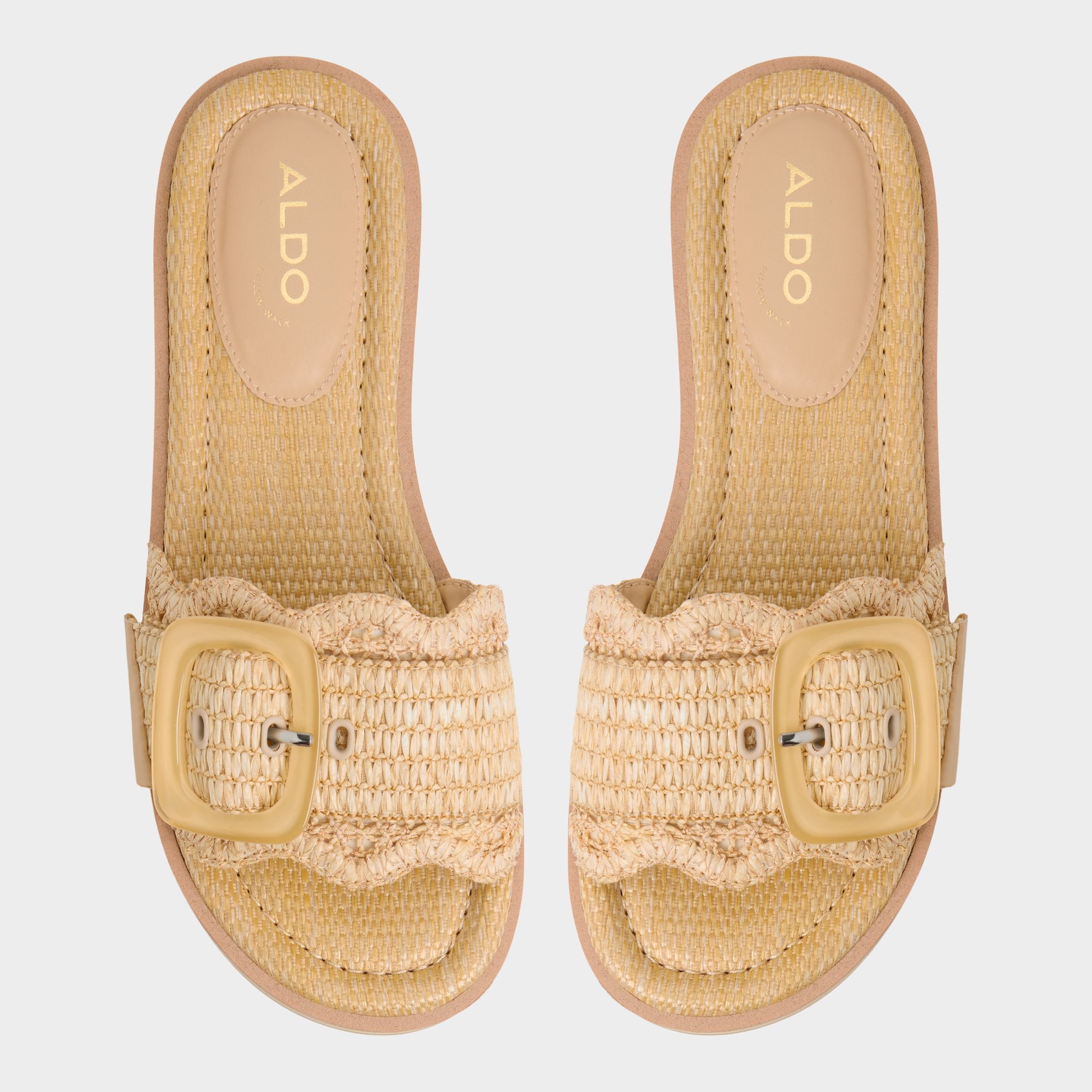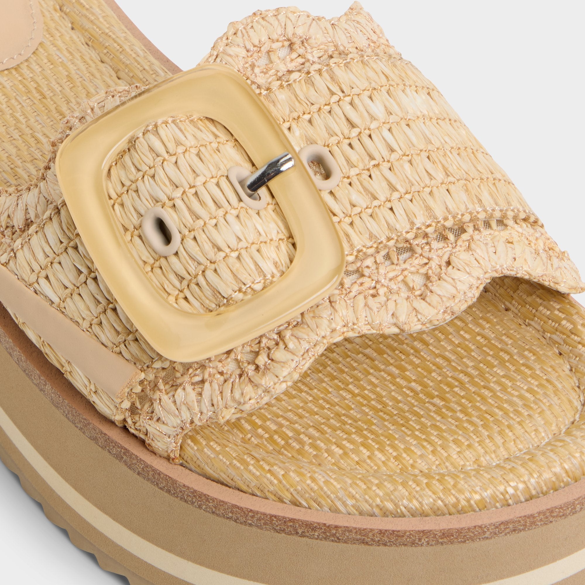 Chunky striped flatform soles give you festival-height without wobble while scalloped raffia strap crowned by oversized buckle brings beachfront texture and all-day cushy support straight to city sidewalks. Pair wide-leg linen for market strolls or ground slinky midi when patio cocktails drift toward impromptu rooftop gigs.