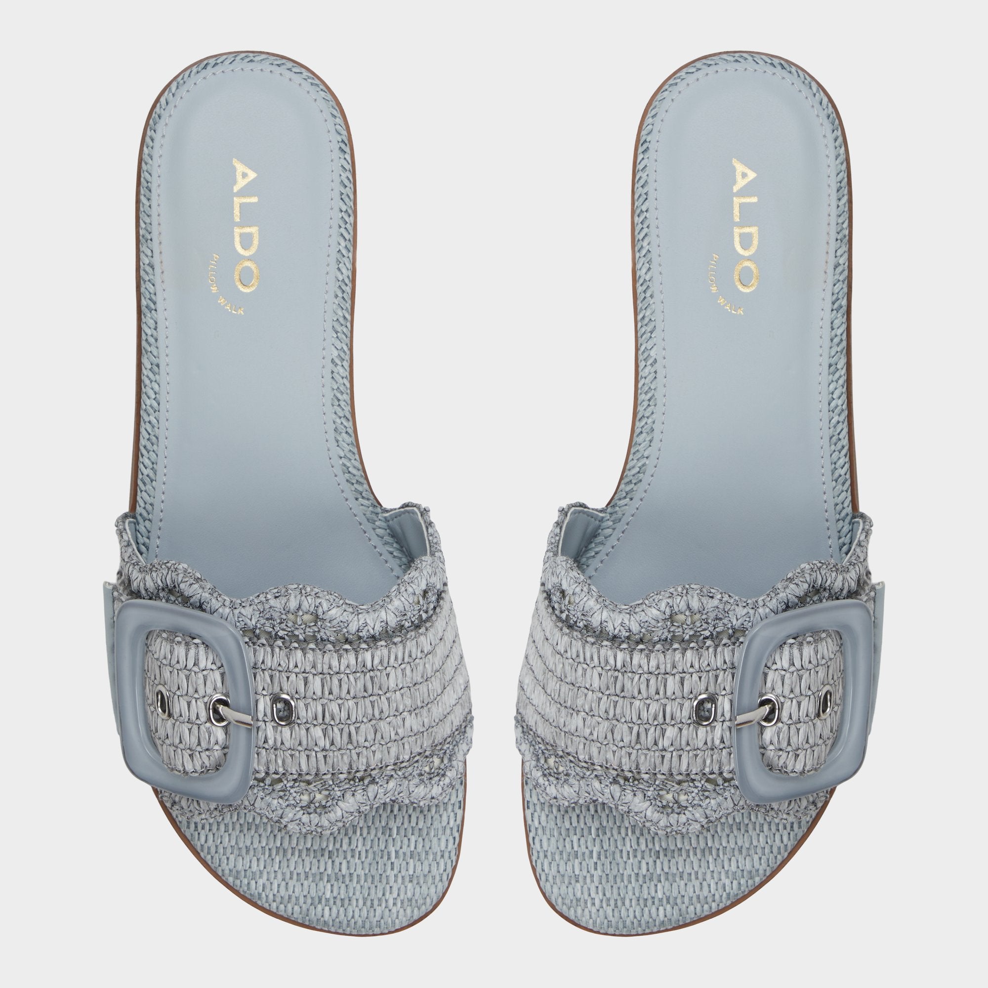 Sky-blue raffia wraps a breezy slide, crowned by an oversized buckle and a cushioned footbed that keeps every sidewalk dash feeling grounded and polished. Pair cropped denim for brunch hops, or slip beneath a gauzy midi when sunset picnics drift toward spontaneous boardwalk strolls, letting this easy, sun-ready slide do the heavy lifting.