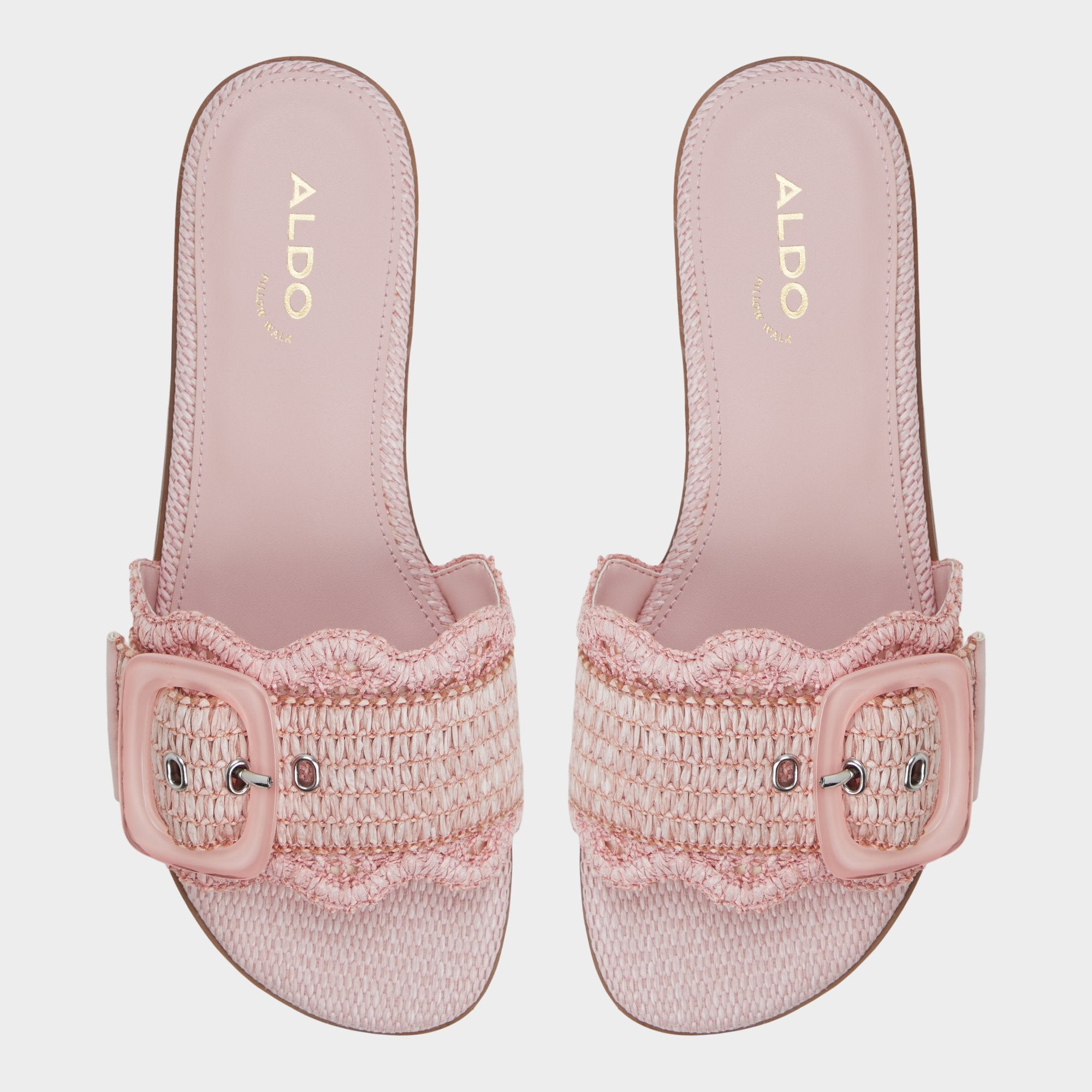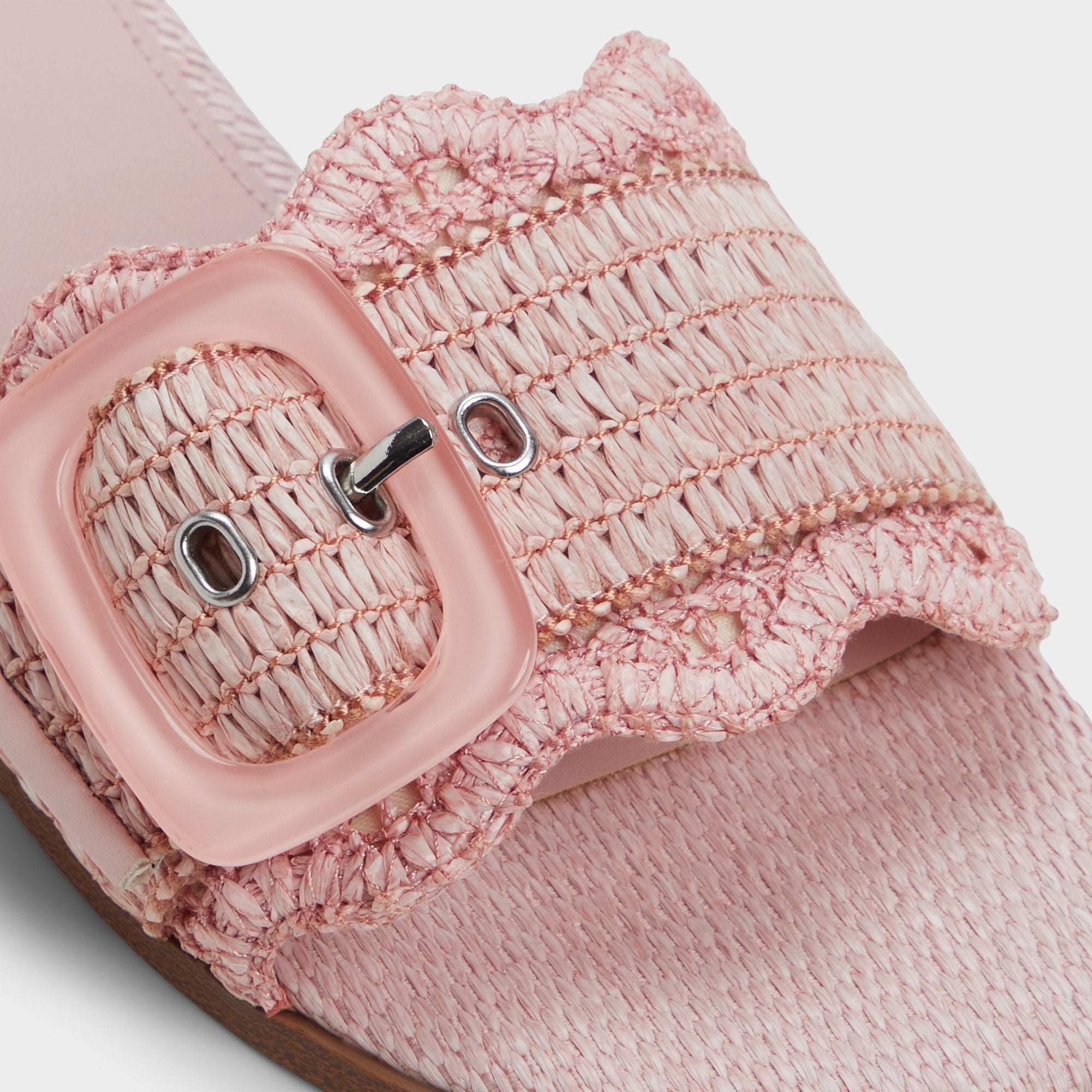 Blush raffia crowns a cushioned easy-slide with a playful ripple and scalloped edges, while an oversized tone-on-tone buckle adds a touch of polish that feels breezy, effortless, and ready for city strolls. Pair with cutoff denim for brunch or slip beneath a gauzy sundress as beach sunsets call.